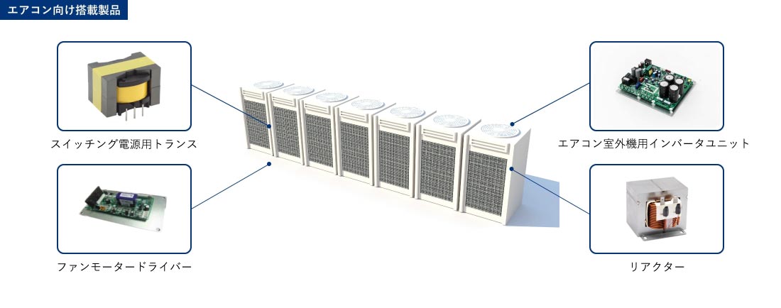 また、軽量で安価なアルミ線を用いたリアクターなどの変成器は、長期信頼性を保証する品質やカスタム提供を可能とする生産力で、国内のみならず、中国などグローバルでも広く採用されています。