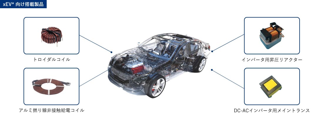 エアコン、給湯器、ファンヒーターなど各種電気製品で使われる制御基板の開発で培ってきた、高い信頼性とノウハウを活かした開発スピードで、カスタム設計による電子制御製品・電源製品を提案・開発して参りました。現在では、ホームエレクトロニクス向けで培った技術を活かし、今後の成長が期待される次世代車向けに、制御基板やアルミ然り線非接触給電コイルやリアクター・トランスなどに積極的に取り組むことで、事業領域をさらに拡大させています。
