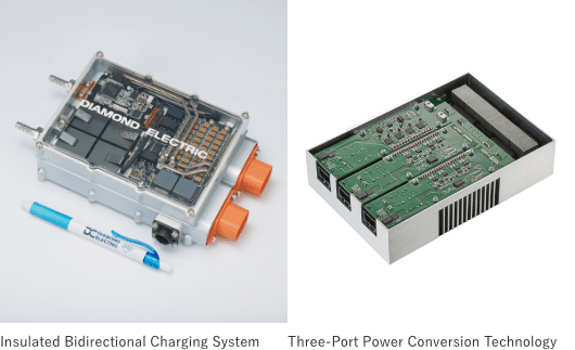 In combination with these in-vehicle power conversion technologies with the grid interconnection technology cultivated in inverter and electricity storage systems, we are promoting the development of V2G* system to charge and discharge electric vehicle storage batteries to commercial power grid systems.