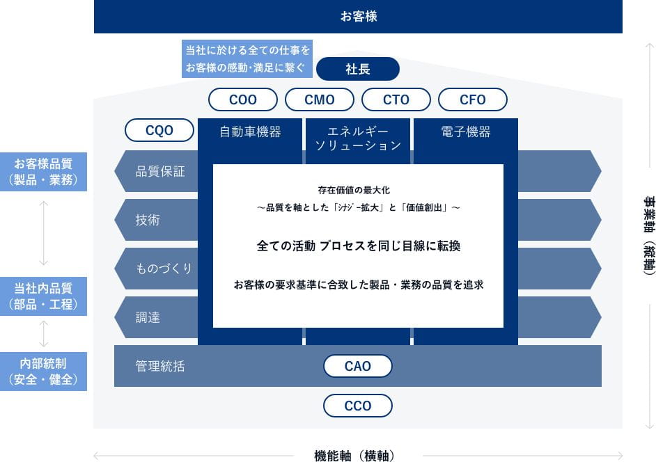 私達は何時如何なる時も「お客様要求品質第一」を徹底して行動し、お客様にとって最も重要である「マーケット品質」と製品品質の肝となる「納入品質」への貢献を真の価値とし、挙社一致体制で “ものづくり(製品・業務)品質の向上” に継続して取り組み続けております。