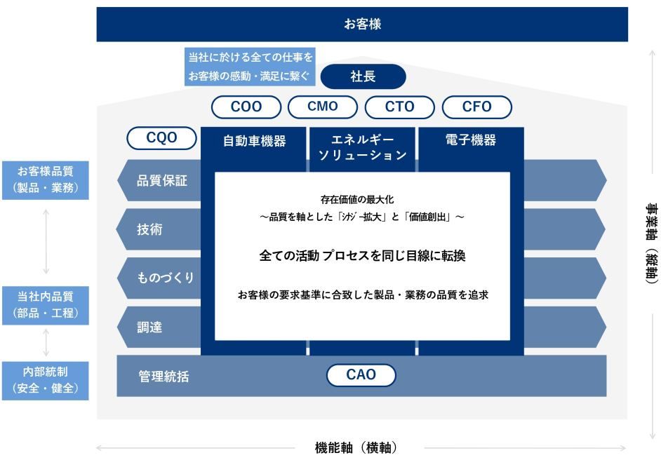 私達は何時如何なる時も「お客様要求品質第一」を徹底して行動し、お客様にとって最も重要である「マーケット品質」と製品品質の肝となる「納入品質」への貢献を真の価値とし、挙社一致体制で “ものづくり(製品・業務)品質の向上” に継続して取り組み続けております。
