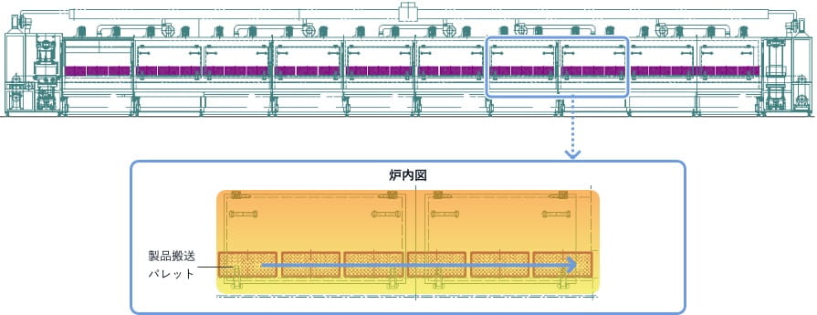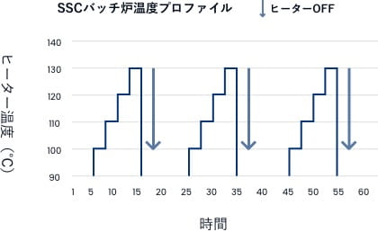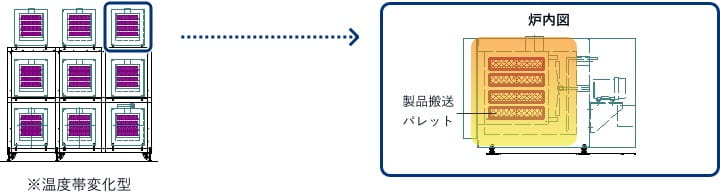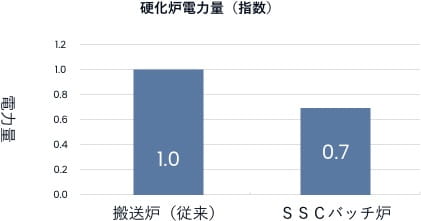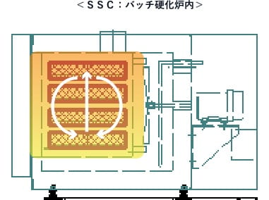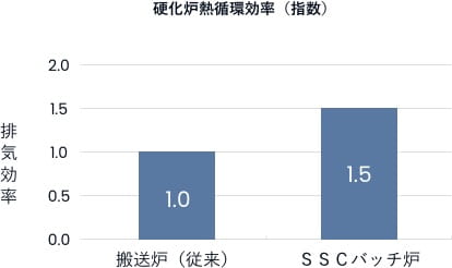 SSCバッチ硬化炉の炉内容積は、従来型硬化炉対比大幅に縮小となっており、また全てのバッチ炉に循環・排気設置することで、熱循環効率を50%(従来比)向上可能となる。